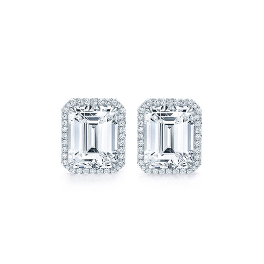 The classic, diamond halo earrings. With a layer of diamonds that encircle the centre diamond and form the earrings edges, the halo accentuates the earring's size and sparkle giving the appearance of pure diamond splendour. Hand crafted with a 0.50ct emerald cut diamond in the centre and a further 0.14ct of halo diamonds. The earrings have a total of 1.28ct of beautiful G colour, SI clarity diamonds with GIA/IGI certificates, masterfully set in 18k white gold. If you would like these earrings made with a different gemstone, size of diamond or to suit a specific budget, contact our team and we can discuss this with you.