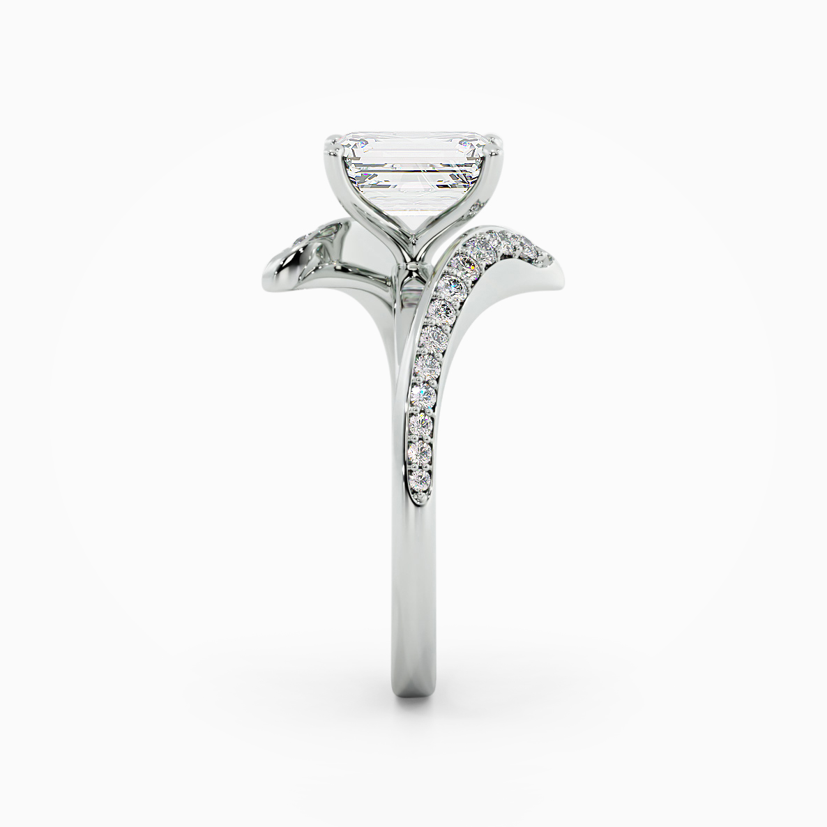 With a white gold band that opens as it gently kisses the edges of the centre diamond, this ring has a beautiful freedom to it, elegantly displaying 0.25ct of diamond melee and the emerald cut diamond centrepiece with vivid life and brilliance. Diamond band engagement rings are a classy elevation of the single stone solitaire. The glamorous addition of shoulder stones gives an extra layer of diamond sparkle which is why diamond band engagement rings are so popular; after all, no-one ever complained about having too many diamonds.