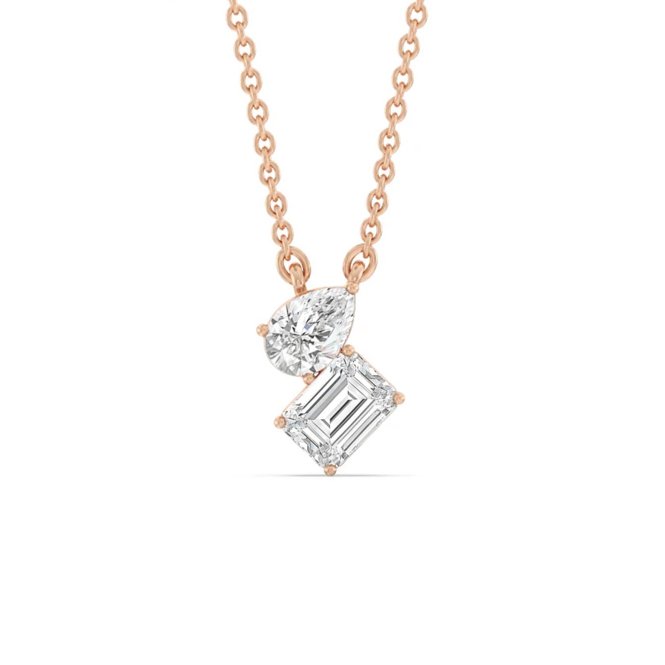 A classic Toi et Moi necklace, featuring side-by-side pear and emerald cut diamonds. Made in 18k rose gold, suspended on an 18 inch chain. Each lab grown diamond weighing 1ct, D colour, VVS clarity, IGI cert. Total carat weight: 2 carats.
