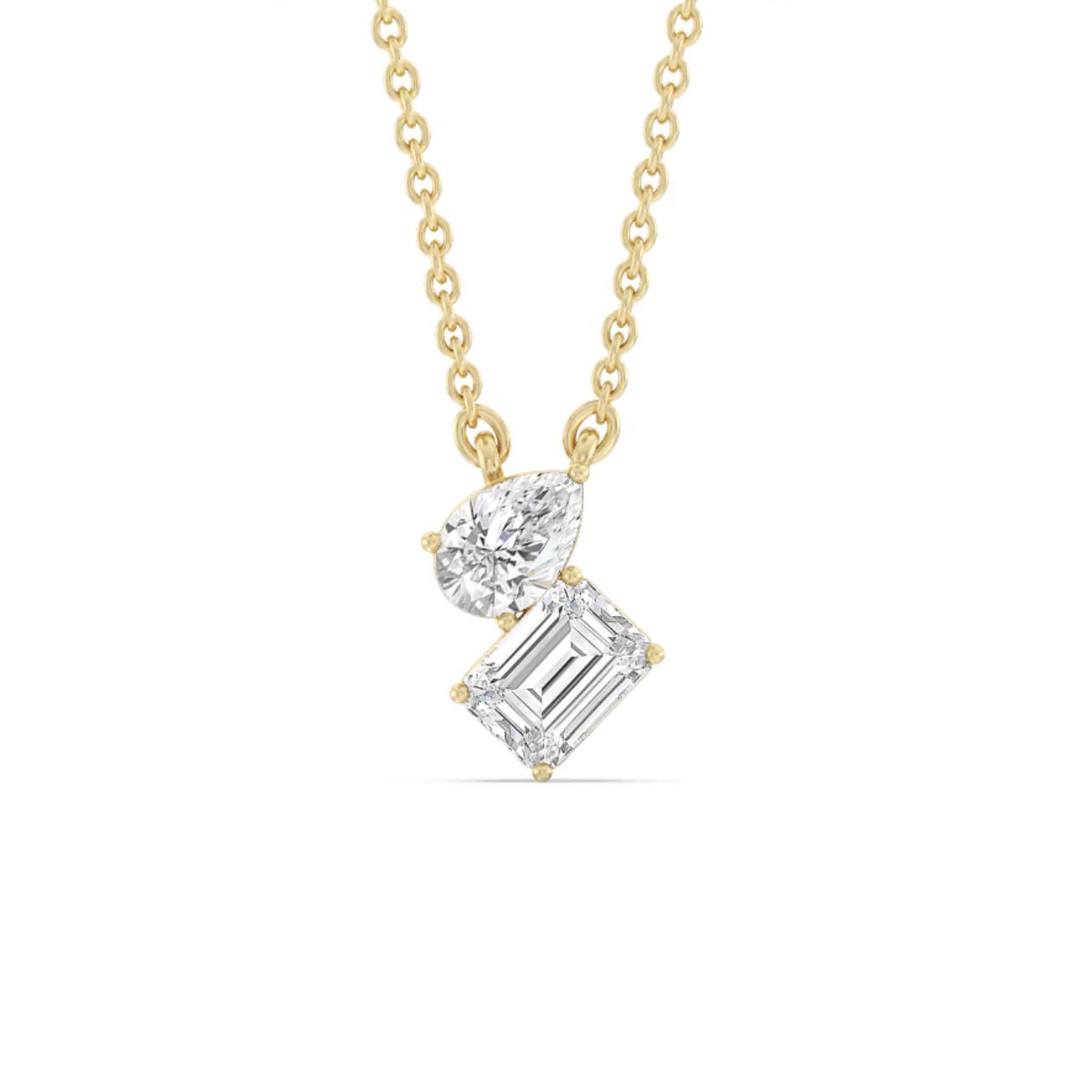 A classic Toi et Moi necklace, featuring side-by-side pear and emerald cut diamonds. Made in 18k yellow gold, suspended on an 18 inch chain. Each lab grown diamond weighing 1ct, D colour, VVS clarity, IGI cert. Total carat weight: 2 carats.